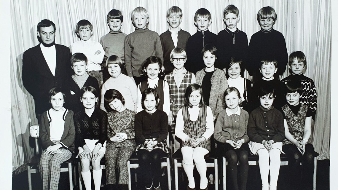 Havremarkens skole, 2. klasse, 1969. Klasselæreren står yderst til venstre. Suzi var bange for ham. Suzi selv sidder som nummer tre fra venstre i første række med hovedet på skrå.